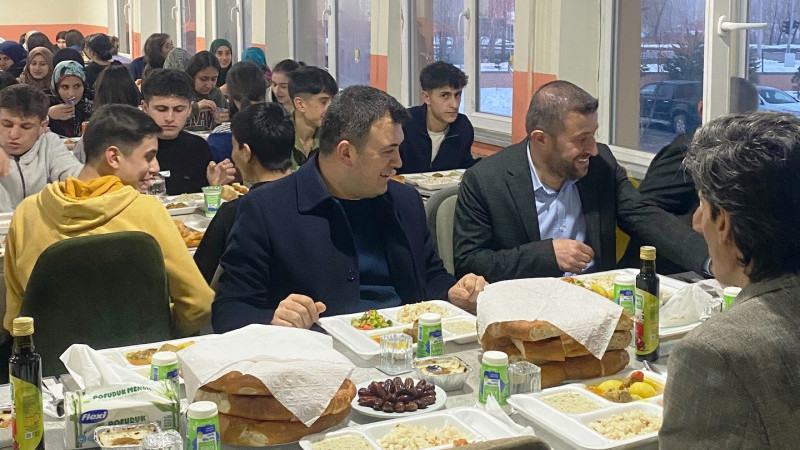 İftar öncesi öğrencilerin masalarını tek tek ziyaret eden Kaymakam Dertlioğlu, gençlerin eğitim durumları ve gelecek planları hakkında bilgi aldı.