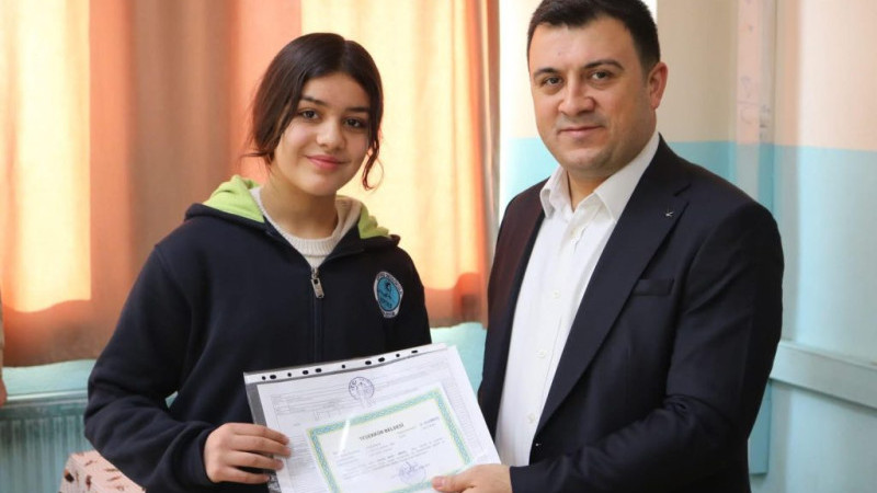 Ziyarette öğrencilerle yakından ilgilenen Dertlioğlu, karneleri bizzat takdim ederek öğrencilere başarılar diledi.